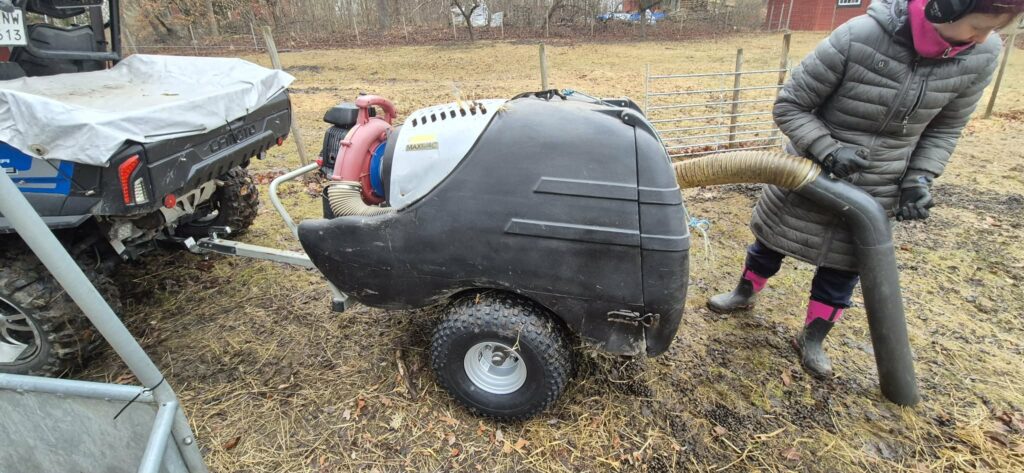 Det är en Greystone Maxivac, avsedd för hästgödsel (funkar perfekt till alpackagödsel) men funkar även på löv eller ekollon som ska fås upp från gräs eller fast underlag. Grus och sand kan den få med sig så det rekommenderas ej att köra på. Funkar även på vått underlag eller högt gräs!